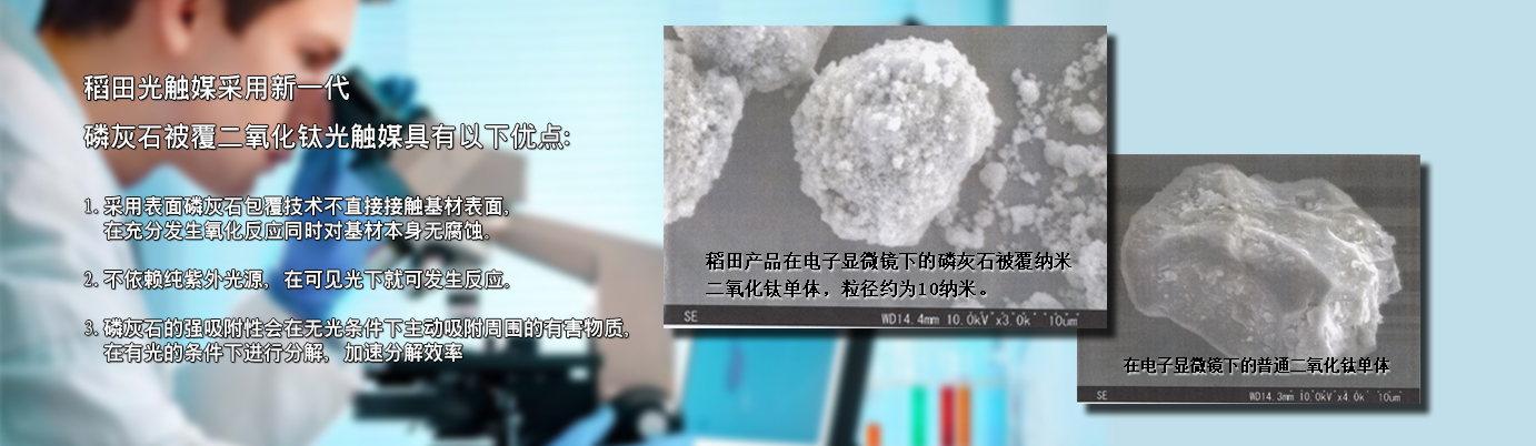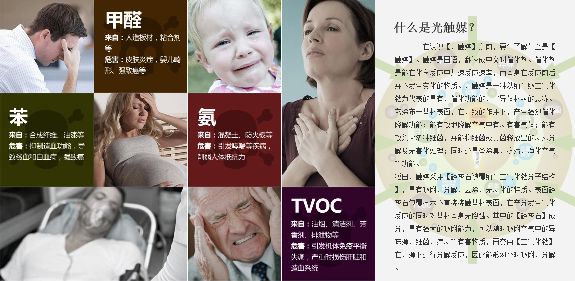 在認(rèn)識【光觸媒】之前,要先了解什么是【觸媒】。觸媒是日語,翻譯成中文叫催化劑。催化劑是能在化學(xué)反應(yīng)中加速反應(yīng)速率,而本身在反應(yīng)前后并不發(fā)生變化的物質(zhì)。光觸媒是一種以納米級二氧化鈦為代表的具有光催化功能的光半導(dǎo)體材料的總稱。它涂布于基材表面,在光線的作用下,產(chǎn)生強烈催化降解功能:能有效地降解空氣中有毒有害氣體;能有效殺滅多種細(xì)菌,并能將細(xì)菌或真菌釋放出的毒素分解及無害化處理;同時還具備除臭、抗污、凈化空氣等功能。 稻田光觸媒采用【磷灰石被覆納米二氧化鈦分子結(jié)構(gòu)】,具有吸附、分解、去除、無毒化的特質(zhì)。表面磷灰石包覆技術(shù)不直接接觸基材表面,在充分發(fā)生氧化反應(yīng)的同時對基材本身無腐蝕。其中的【磷灰石】成分,具有強大的吸附能力,可以隨時吸附空氣中的異味源、細(xì)菌、病毒等有害物質(zhì),再交由【二氧化鈦】在光源下進(jìn)行分解反應(yīng),因此能夠24小時吸附、分解